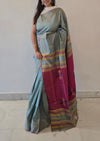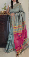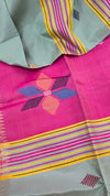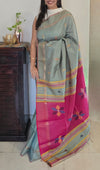 They are woven in Katan Silk, which is considered to be one of the finest handwoven silks produced in India. The hallmark of these sarees lies in their intricate motifs, such as paisleys, peacocks, and geometric patterns, coupled with vibrant, earthy color palettes. These sarees are woven primarily using high-quality cotton and silk. The weaving process involves meticulous handloom work, where precision is key to achieving the intricate designs. The use of natural dyes and labor-intensive weaving techniques ensures the sarees retain their authenticity and are eco-friendly. The borders and pallus are often adorned with fine zari work, adding a subtle touch of luxury.