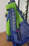 The saree features a harmonious combination of white and green hues. White represents purity, simplicity, and elegance, while green symbolizes nature, growth, and freshness. Together, they create a soothing and vibrant color palette that is perfect for various occasions. Elegant and sober ikat pattern with intricate Parrot motif is skillfully woven in the body. The green border provides a frame to the body and accentuating its beauty. It adds a pop of color and contrast to the saree, enhancing its overall appeal.