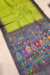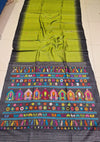 The body of the Dolabedi saree is adorned with buttas, creating a vibrant canvas. The pallu, equally resplendent, features intricate designs of turtles, parrots, and chariots, symbolizing the joyous festivities. The vibrant pallu beautifully contrasts with the relatively plain and simple body, exuding a regal aura. Thesei sarees are skillfully woven using various weaving techniques, including jala and dobby